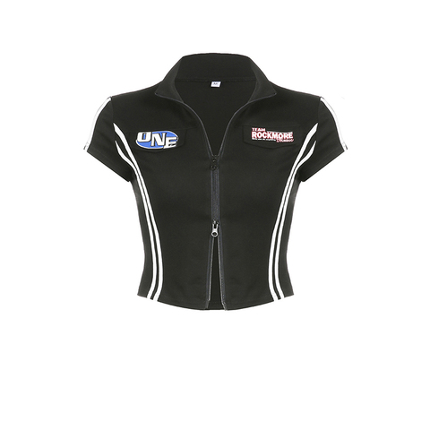 Cao Đường Phố OEM Thêu Logo Cắt Ngắn Tay Áo Áo Sơ Mi Màn Hình In Sườn Zip up Crop Tops Biker T Áo Sơ Mi